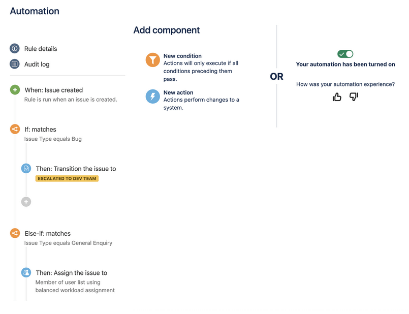 Deze elementen gecombineerd zorgen ervoor dat je rule uitgevoerd wordt. Het Automation rules overzicht in Jira biedt een samenvatting van de rules waarbij je bijvoorbeeld kan aangeven of je notificatie wilt krijgen als een rule niet uitgevoerd kan worden, of andere rules deze rule kunnen activeren en of het voor een enkel project geldt, meerdere, of een globale rule is. In het bijbehorende audit log kan je de status bijhouden van iedere keer dat de rule is uitgevoerd.