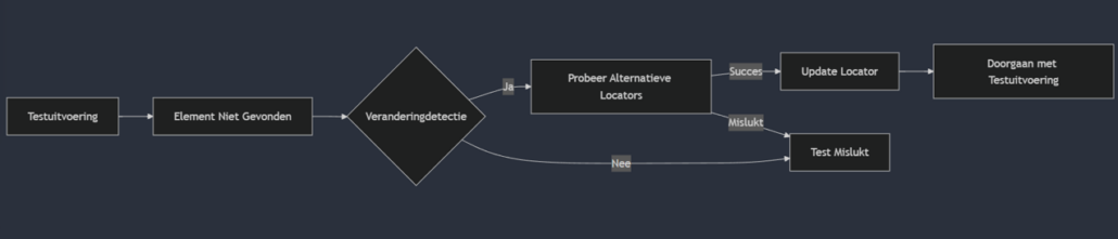 - Locator-updating: Zodra een verandering is gedetecteerd, probeert het self-healing mechanisme het element te vinden met alternatieve locators of strategieën. Als dit lukt, werkt het de locator voor het overeenkomstige object in de test bij. Op deze manier kan de test doorgaan met uitvoeren en zullen toekomstige testuitvoeringen de bijgewerkte locator gebruiken